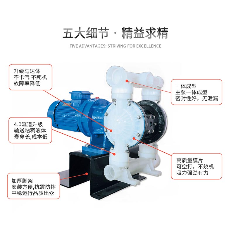 - 8、由于隔膜將被輸送介質(zhì)和傳動(dòng)機(jī)械件分開,所以介質(zhì)非常不會(huì)向外泄漏;且電動(dòng)隔膜泵本身無軸封,使用壽命大大延長;根據(jù)不同介質(zhì),隔膜可分為氯丁橡膠、氟橡膠、丁晴橡膠、聚四氟乙烯、聚氨酯等,可以滿足不同客戶的要求。
